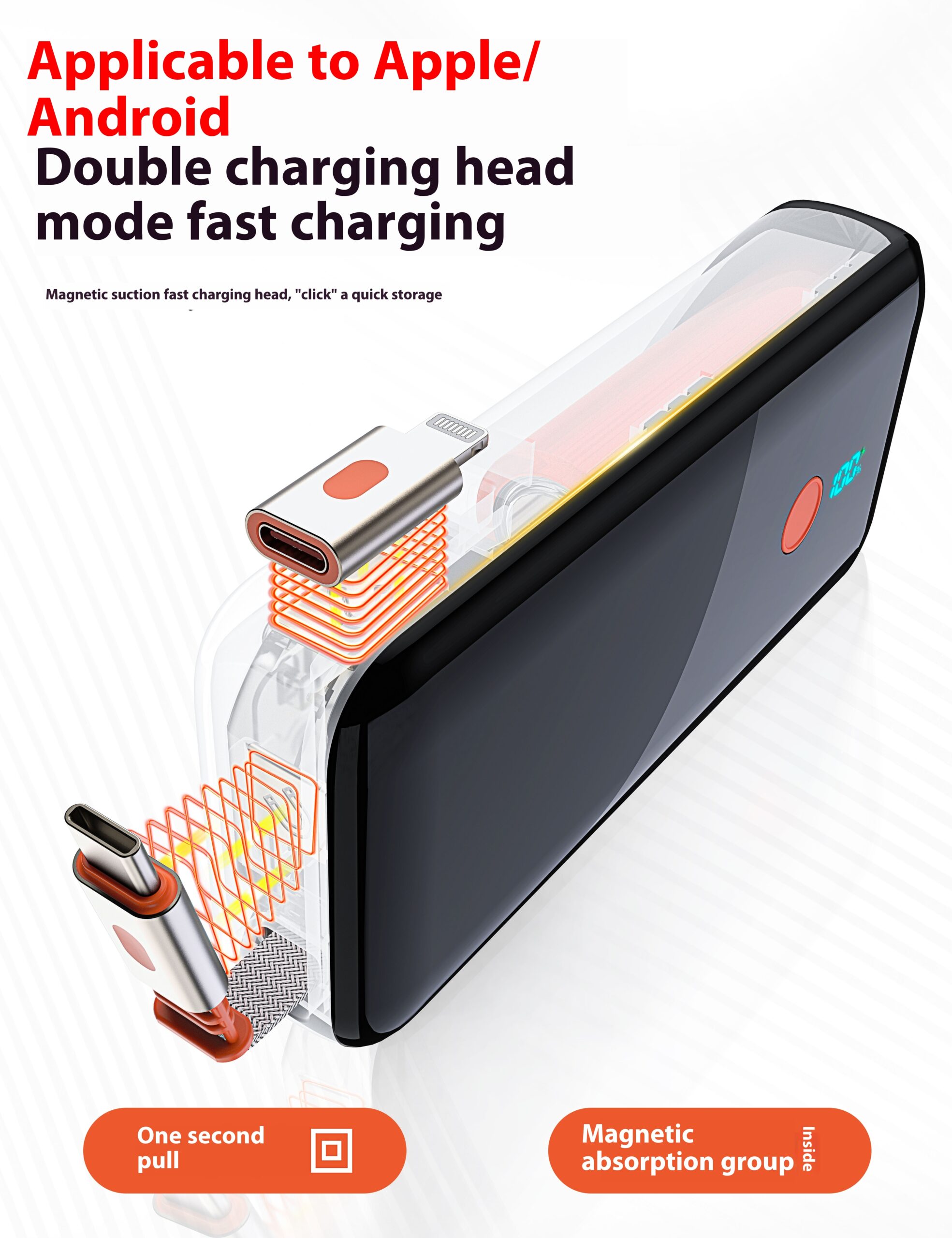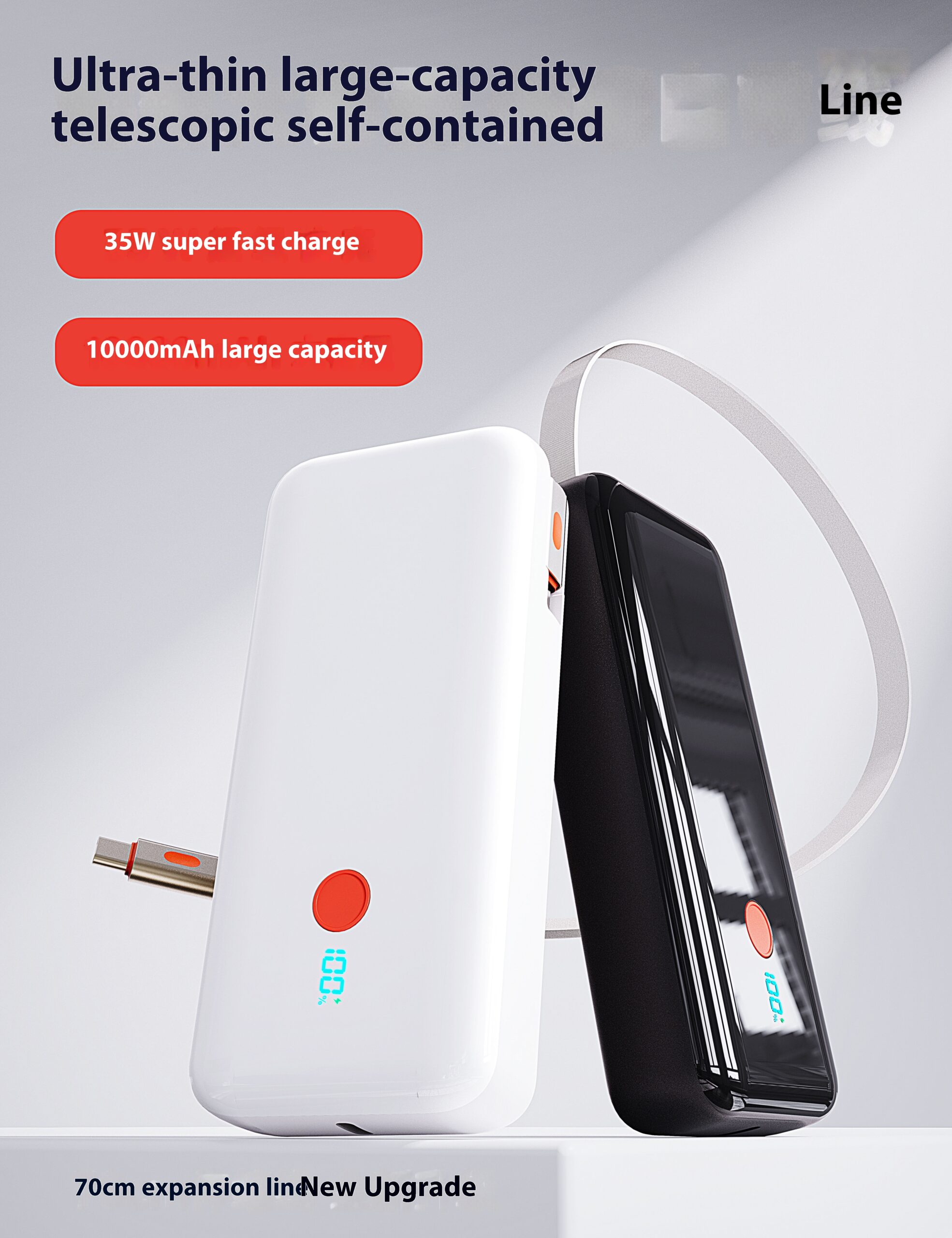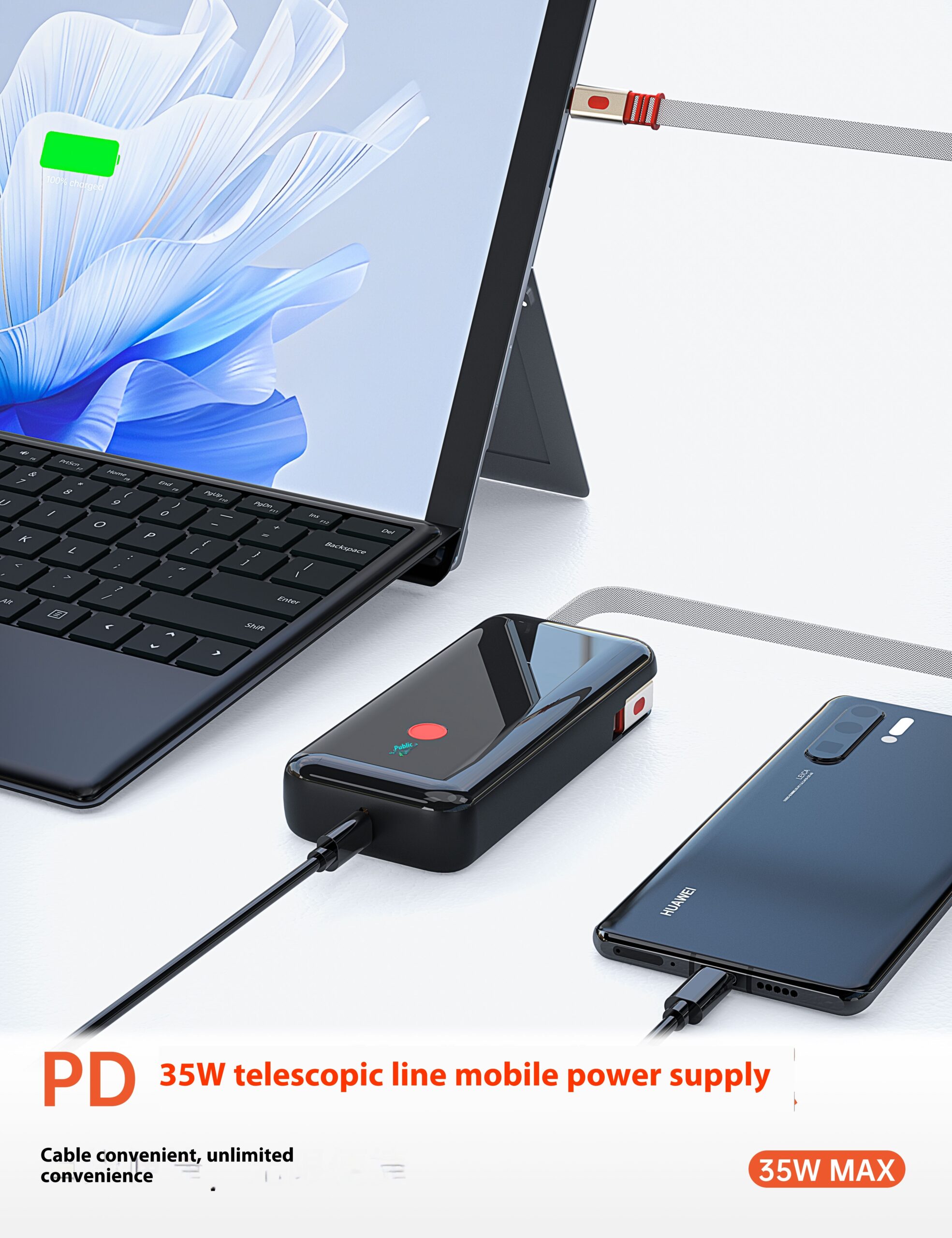 This power bank comes equipped with a powerful 35W output, making it ideal for charging your smartphone, tablet, or other USB-enabled devices swiftly. The 70cm retractable cord eliminates tangled wires and clutter, enabling you to charge your devices with ease. The durable ABS and PC materials ensure that this power bank withstands the rigors of everyday use, providing shock-resistant protection against drops and impacts.