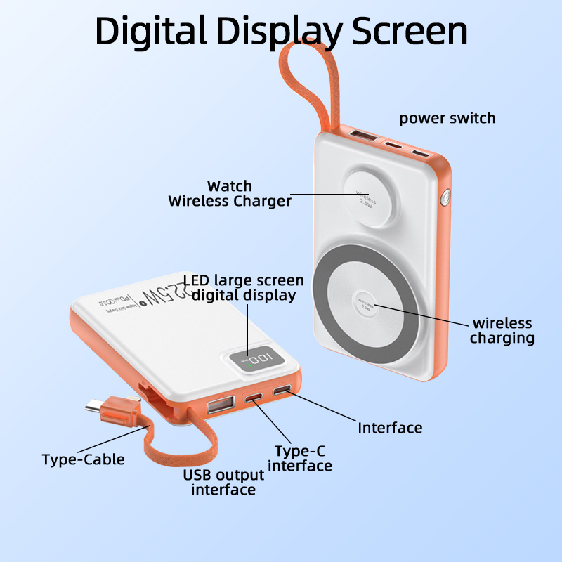 This power bank stands out with its built-in cable, providing convenience without the hassle of carrying multiple chargers. Its magnetic design allows it to easily attach to your device, ensuring you can power up on the move. The digital display offers real-time information on the remaining battery life, so you can manage your usage effectively and avoid running out of power unexpectedly.