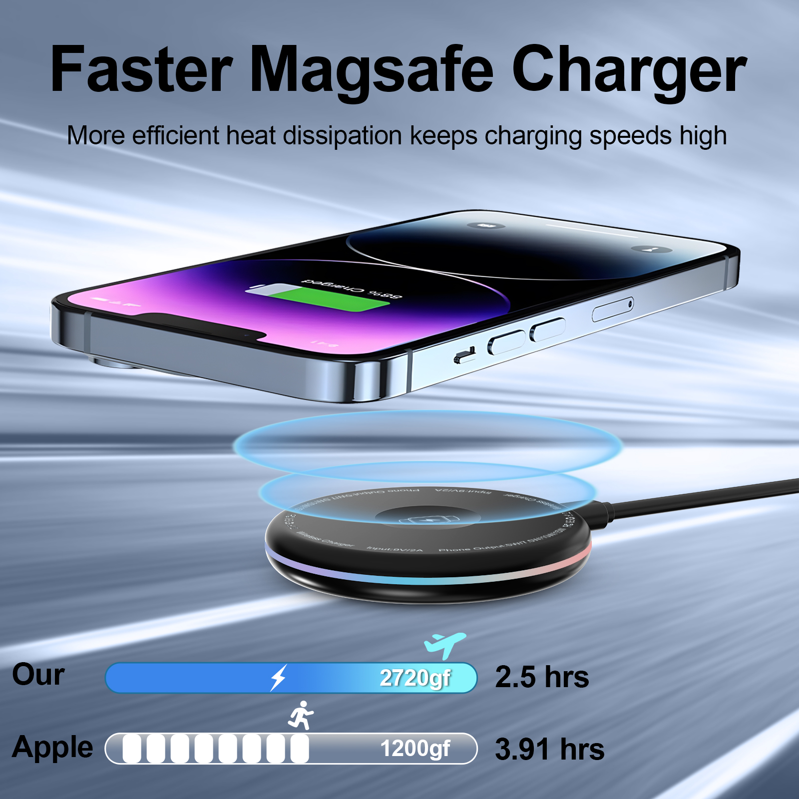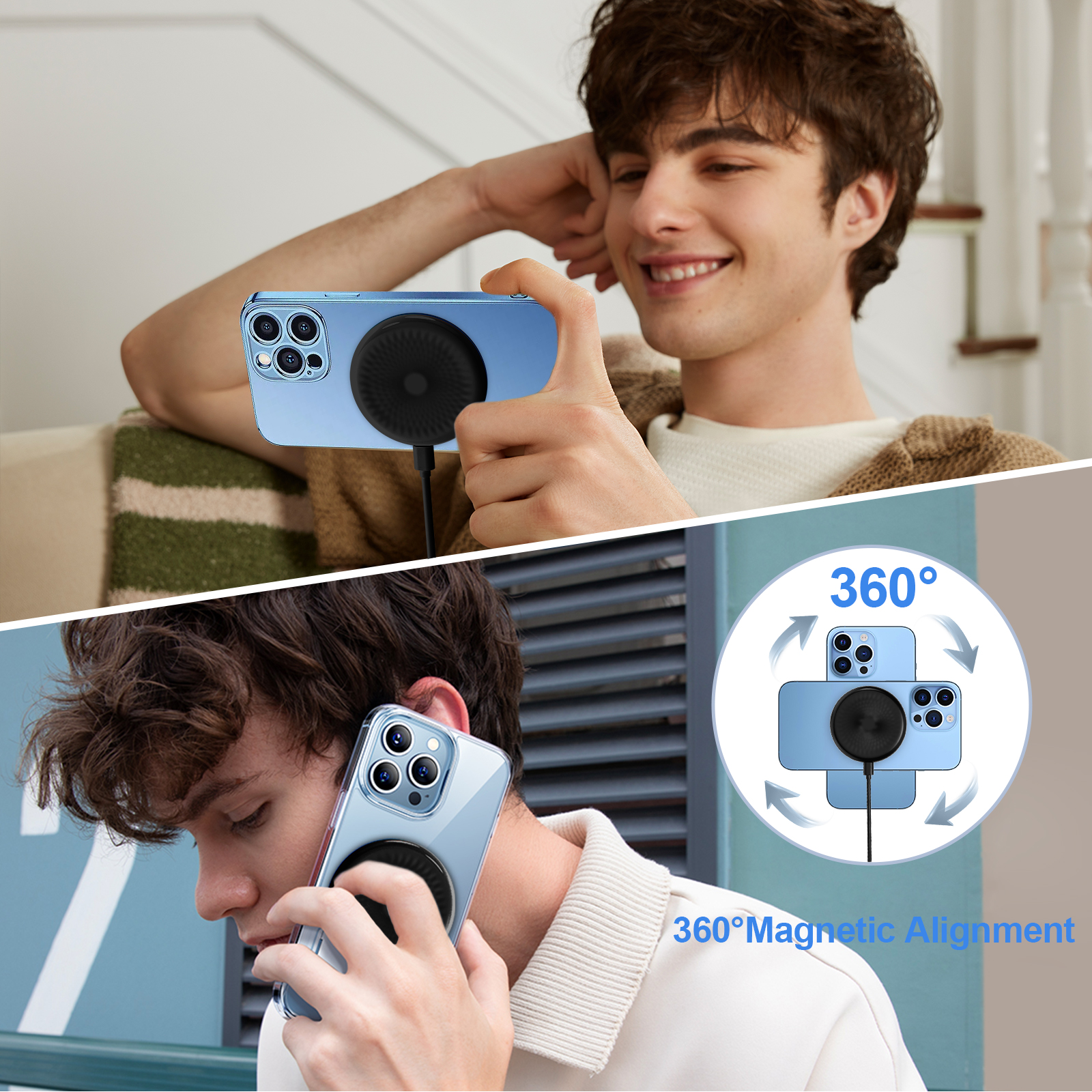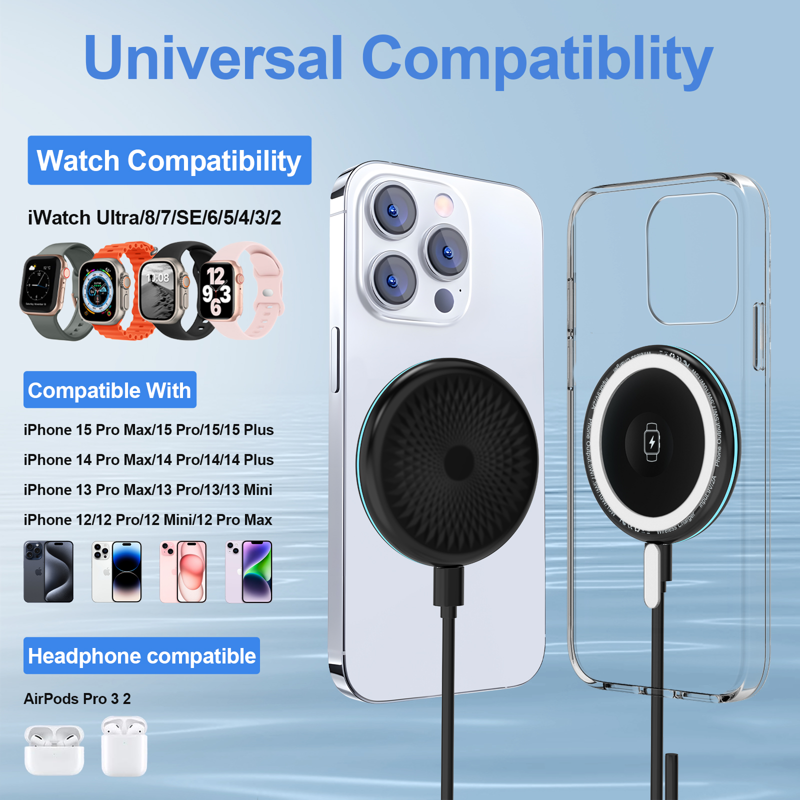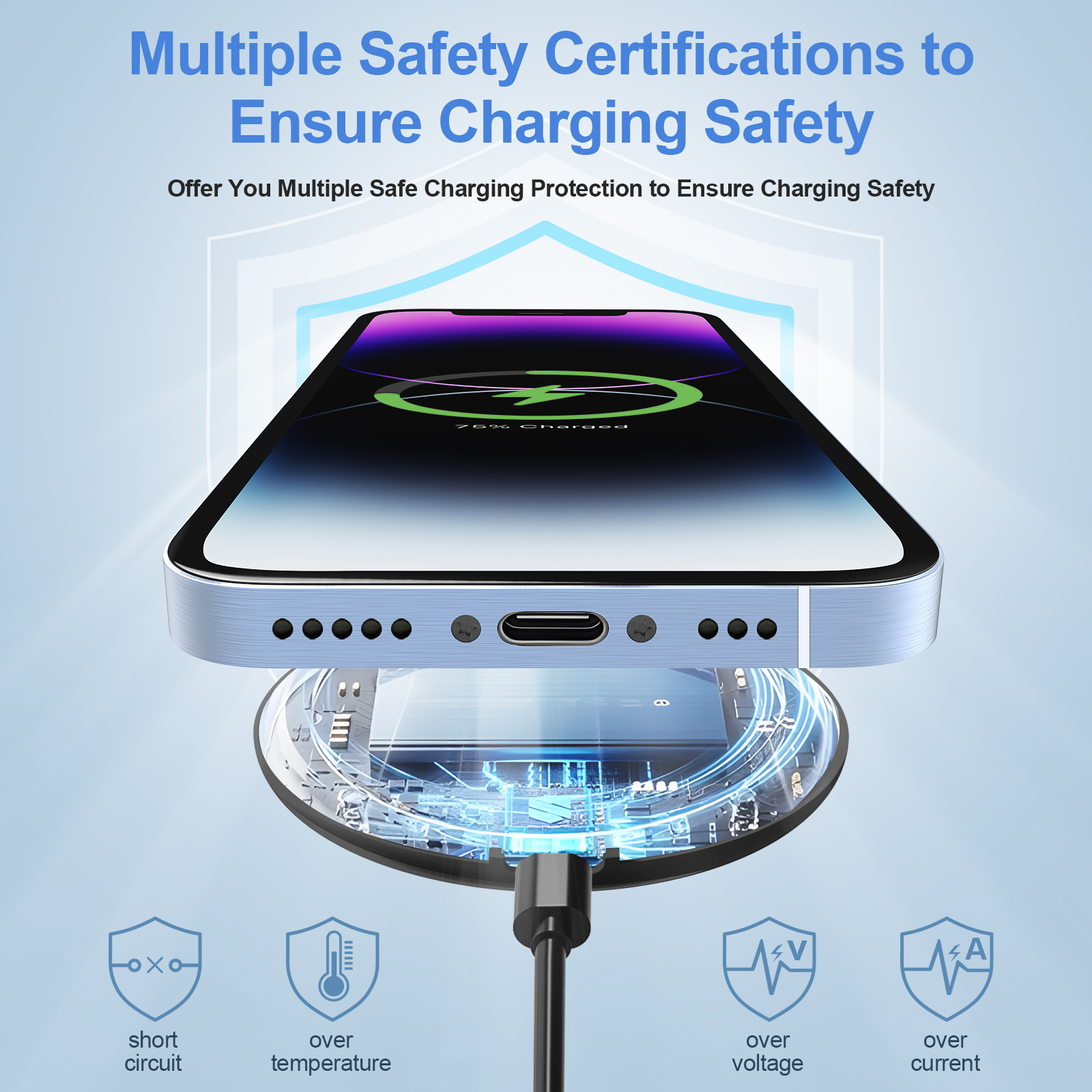 Our wireless charger supports multiple output modes of 15W, 10W, and 7.5W, ensuring compatibility with a wide variety of smartphones. Whether you’re in a rush or just setting your phone down for the night, this charger accommodates your needs, delivering a fast and efficient charge every time. With an output power of 15W, your devices get back to full power in record time, allowing you to stay productive throughout your day.