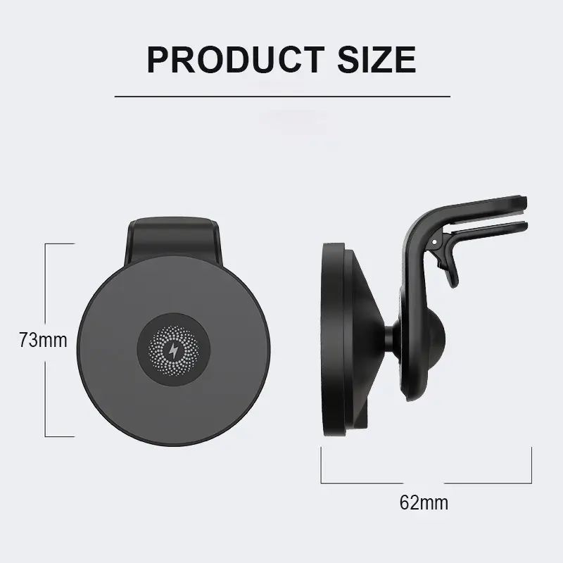 Your safety is our priority. The 15W Magnetic Car Wireless Charger is equipped with advanced overcurrent and overvoltage protection mechanisms, providing peace of mind while you drive. Constructed from durable plastic, this charger is built to withstand the rigors of daily use, ensuring both longevity and reliability. Measuring at a compact size of 72 x 59 x 66mm and weighing only 46g (gross weight of 57.5g including packing), it conveniently fits into any car cup holder or can be mounted on your dashboard for easy access.